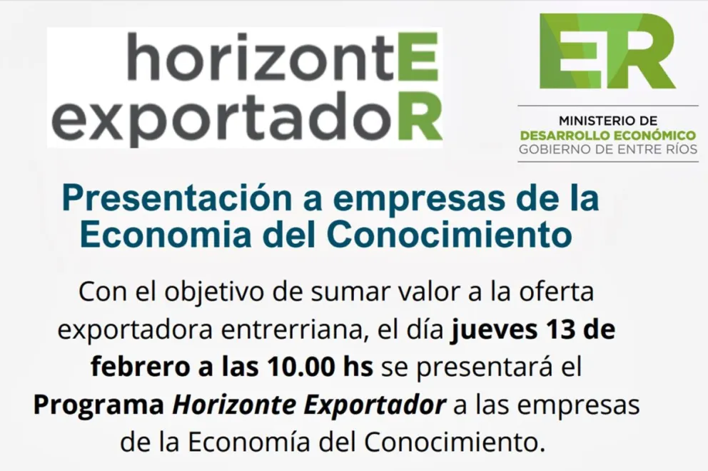 Con el objetivo de sumar valor a la oferta comercial entrerriana, este jueves, a las 10 de la mañana y de manera virtual, se presentará el Programa Horizonte Exportador a  empresas de la Economía del Conocimiento de Entre Ríos.