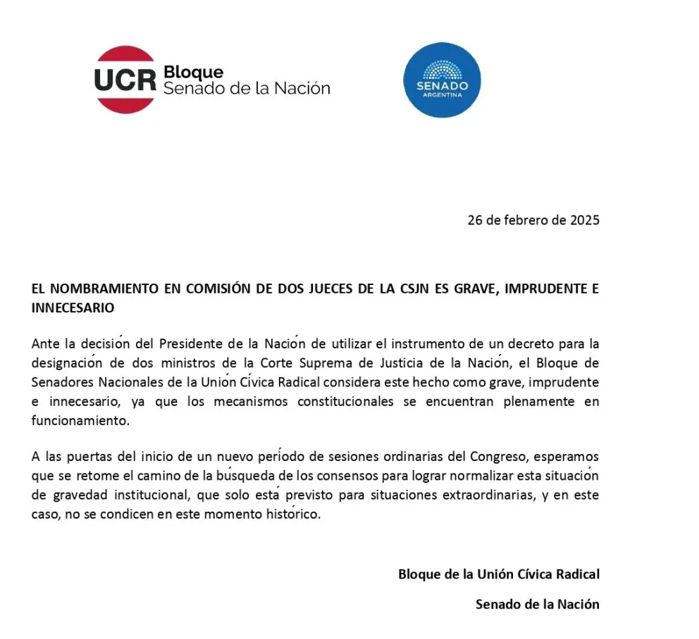 Con el título “El nombramiento en comisión de dos jueces de la CSJN es grave, imprudente e innecesario” el bloque de la UCR expresó que “ante la decisión del Presidente de la Nación de utilizar el instrumento de un decreto para la designación de dos ministros de la Corte Suprema de Justicia de la Nación, el Bloque de Senadores Nacionales de la Unión Cívica Radical considera este hecho como grave, imprudente e innecesario, ya que los mecanismos constitucionales se encuentran plenamente en funcionamiento”.