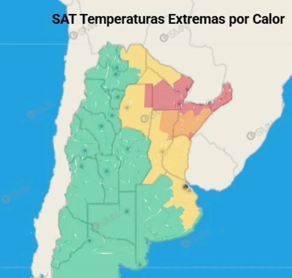 Todo el territorio provincial se encuentra en alerta nivel amarillo por temperaturas extremas por calor, de acuerdo a un informe del Servicio Meteorológico Nacional (SMN).