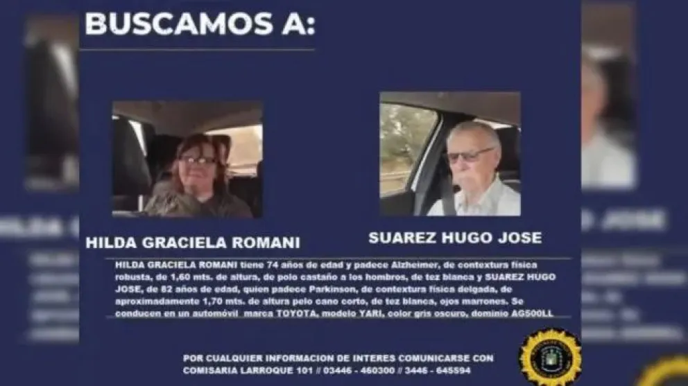 Se trata de Hilda Graciela Romani, de 74 años y Hugo José Suárez, de 82 años, quienes se ausentaron de su domicilio en Larroque el pasado lunes el 24 de marzo.