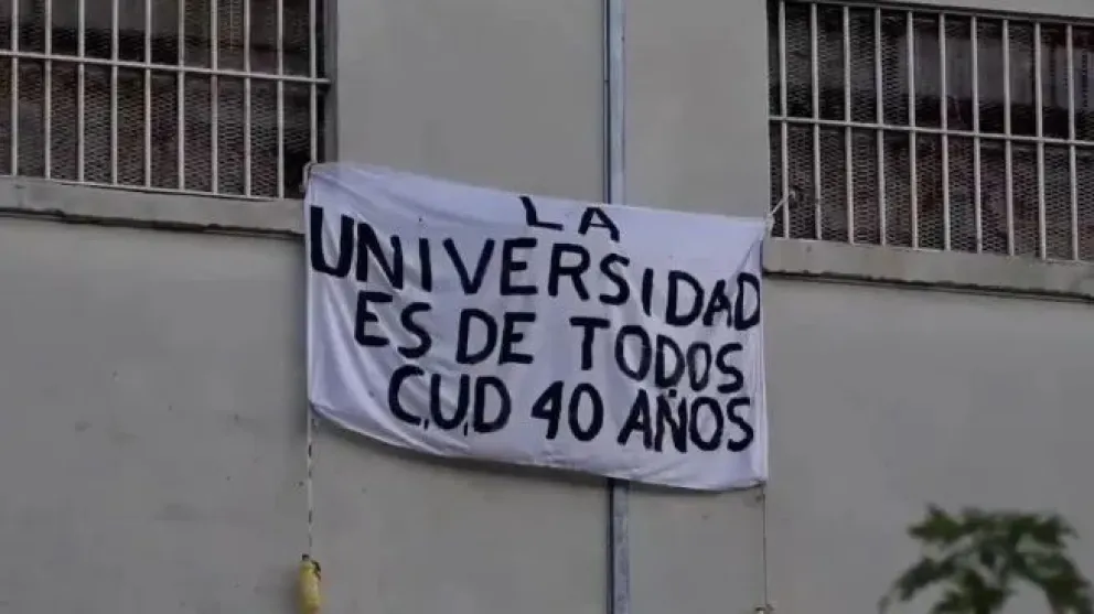 “Tenemos derecho a la educación 1985-2025”, se podía leer en una de las banderas que colgaban de los barrotes de la cárcel, ubicada en la calle Bermúdez 2651, en el barrio porteño de Villa Devoto. Otra de las pancartas decía: “La Universidad es de todos. CUD. 40 años”.