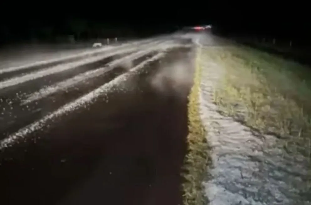 Imágenes en la Ruta Provincial 2, en la localidad de San Pedro, ubicado entre las localidades de Chajarí y Los Conquistadores, muestran las banquinas completamente cubiertas de granizo.
