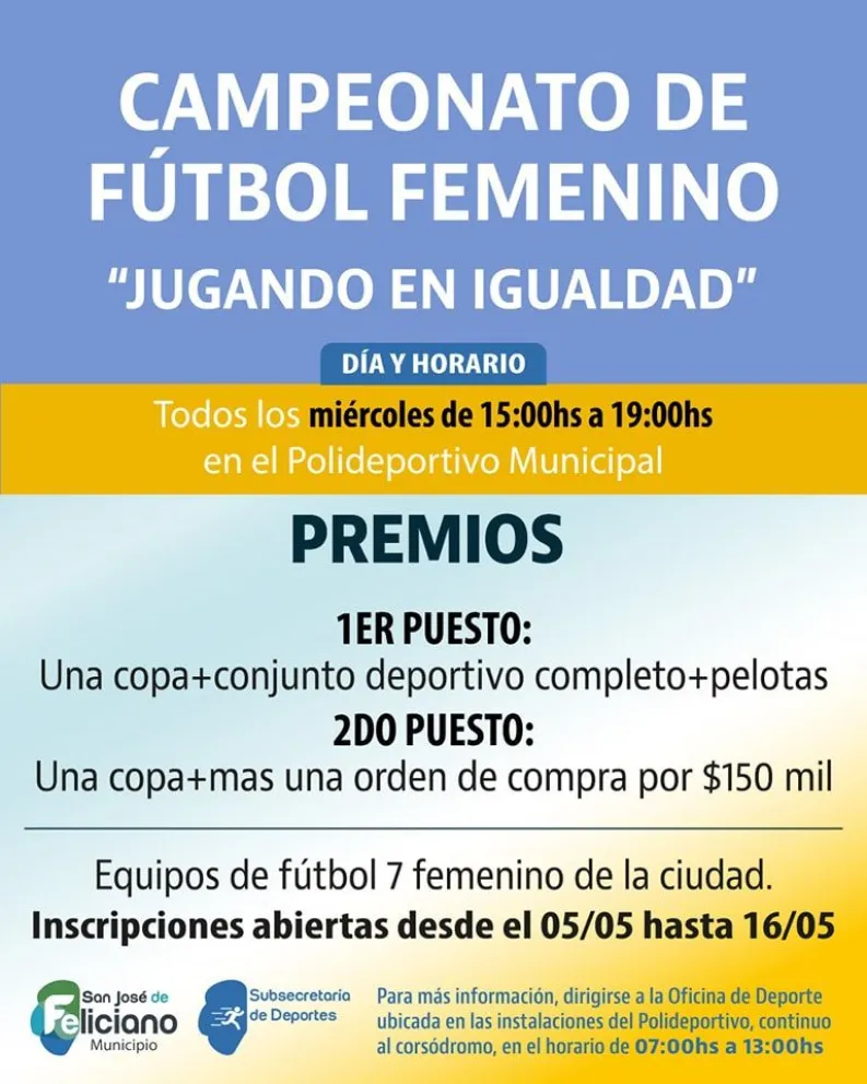 La Subsecretaría de Deportes de la Municipalidad de Feliciano anunció la realización del campeonato de fútbol femenino “Jugando en Igualdad”, que se disputará todos los miércoles de 15 a 19 en el Polideportivo Municipal. Es para equipos de fútbol 7 y las inscripciones están abiertas hasta el 16 de mayo.