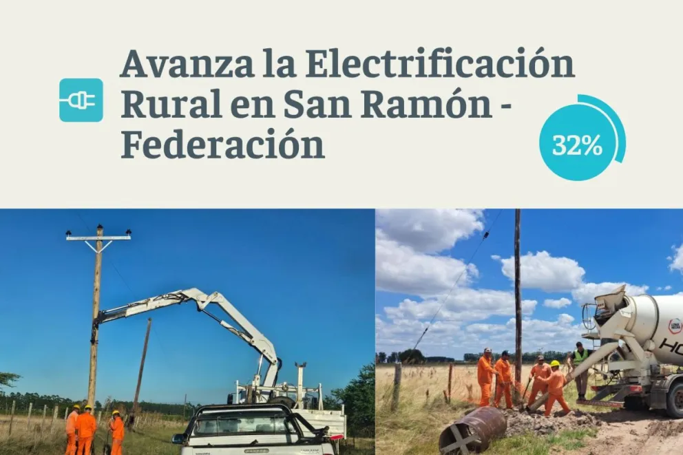 En el marco del Programa de Electrificación para la Producción y el Arraigo Rural (PEPAR), el gobierno de Entre Ríos, a través de la Secretaría de Energía, avanza con obras estratégicas de infraestructura eléctrica que apuntan a fortalecer el desarrollo rural y productivo en diferentes puntos del territorio. Una de ellas se lleva adelante en San Ramón, departamento Federación, la cual tiene un avance de 32,07 por ciento y, una vez finalizada, permitirá conectar a 49 usuarios.