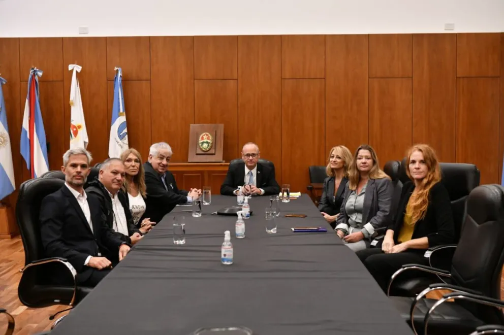 El presidente del Superior Tribunal de Justicia de Entre Ríos (STJ), vocal Leonardo Portela, junto la vicepresidenta del cuerpo, vocal Laura Mariana Soage y la vocal Gisella Schumacher, se reunieron este martes con el secretario general de la Unión de Empleados Judiciales de la Nación (UEJN), Julio Piumato y su par provincial, Bibiana Stark.