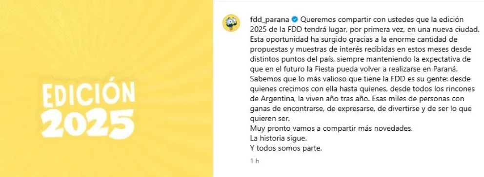 A través de un comunicado difundido en sus redes oficiales, los organizadores señalaron que esta decisión se tomó "gracias a la enorme cantidad de propuestas y muestras de interés recibidas en estos meses desde distintos puntos del país", aunque aseguraron que mantienen la expectativa de que la FDD vuelva a realizarse en Paraná en futuras ediciones.