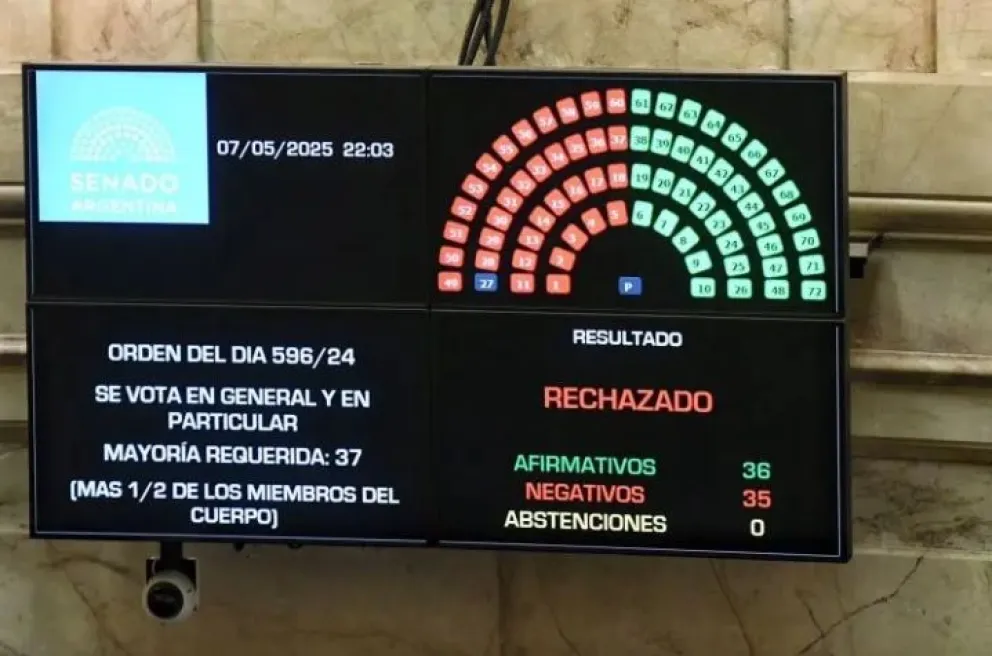 La votación, realizada minutos después de las 22 de este miércoles, marcó en el tablero 36 votos a favor y 35 en contra, lo que dejó a los impulsores de la norma pasmados, mientras el kirchnerismo estalló en festejos dentro del recinto, ante una visiblemente sorprendida vicepresidenta Victoria Villarruel. Al resultar rechazada, la iniciativa no podrá tratarse por lo que resta del año.