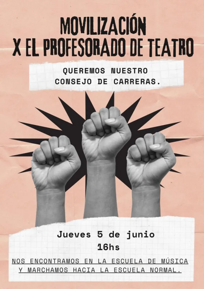 "Exigimos la creación de un Consejo de Carreras exclusivo para el Profesorado de Teatro, que no se comparta con las carreras de Música, Canto y/o Instrumentos. Entendemos que, si bien formamos parte del mismo campo disciplinar, nuestras trayectorias, planes de estudio y problemáticas requieren espacios propios de discusión y toma de decisiones."