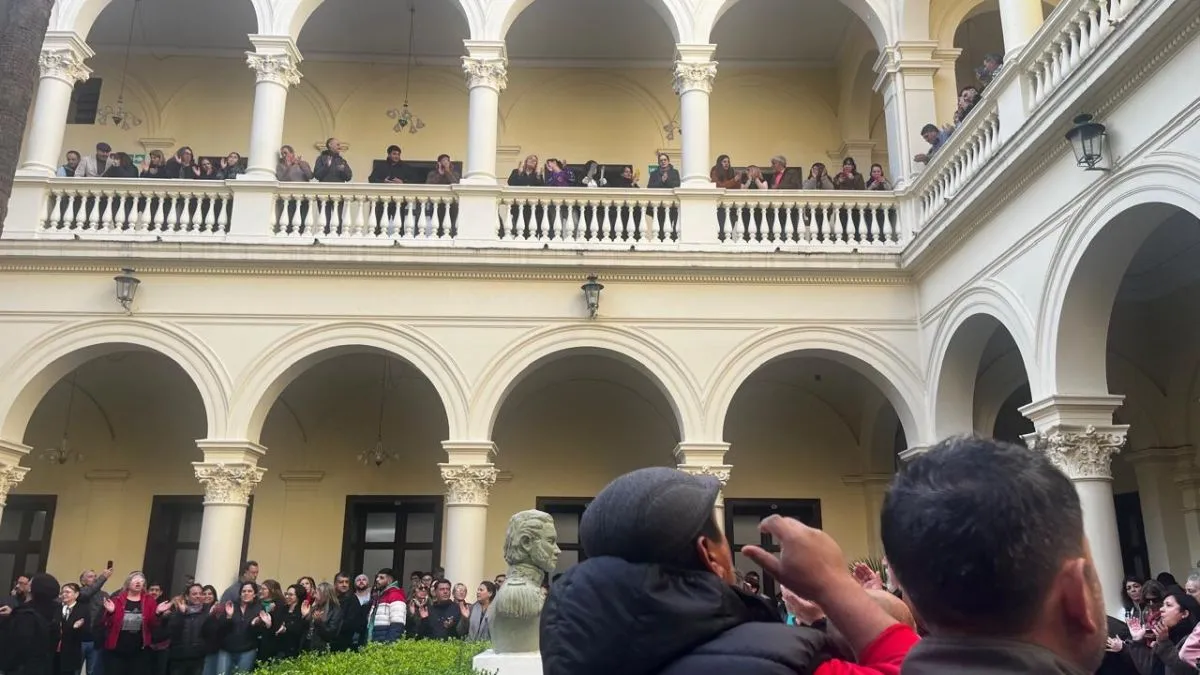 Una gran cantidad de trabajadores autoconvocados realizan una protesta en el interior de la Casa Gris para expresar su malestar con la decisión del Gobierno provincial de recortar el 25% de las horas extra que percibe el personal de la administración pública. Le solicitarán una audiencia al gobernador Rogelio Frigerio.