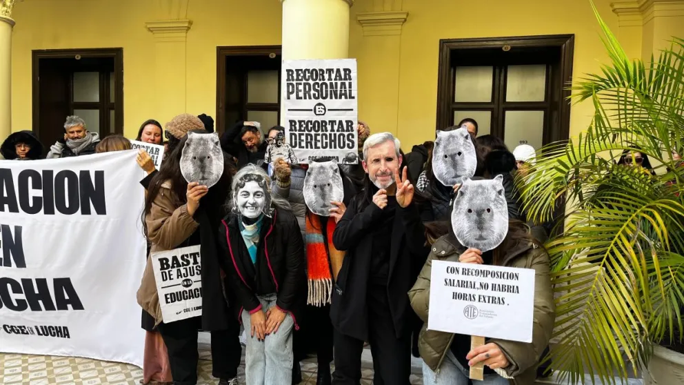 Este miércoles por la mañana, trabajadores estatales de diversos ministerios se reunieron nuevamente en el patio de la Casa Gris. A pesar de los cantos, los carteles y el ruido, se notó una merma en la cantidad de manifestantes. Al ingresar, sonaban cánticos como “Che Frigerio”, entre otros. Para facilitar el desarrollo de la asamblea, los organizadores llevaron un parlante y un micrófono, lo que permitió escuchar con claridad a los oradores.