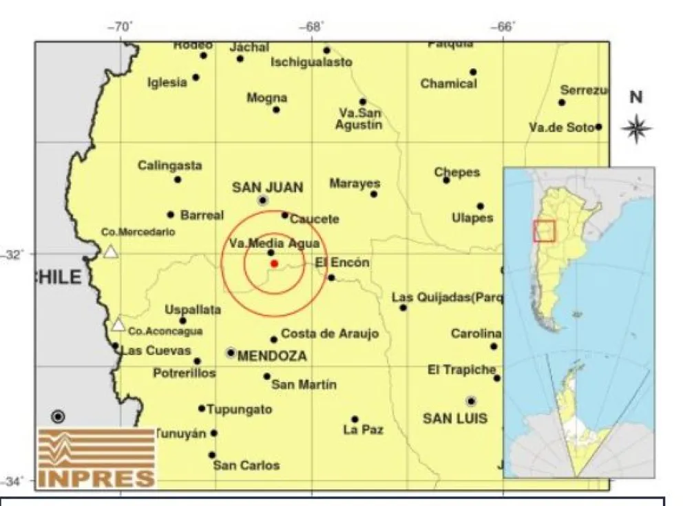 El epicentro se ubicó a 59 kilómetros al oeste de El Encón y fue percibido con una intensidad Mercali Modificada de III en Media Agua, Los Berros, Caucete, Ciudad de San Juan, Ciudad de Mendoza y otras localidades mendocinas; y levemente en Chepes y Ciudad de Córdoba. (APFDigital)