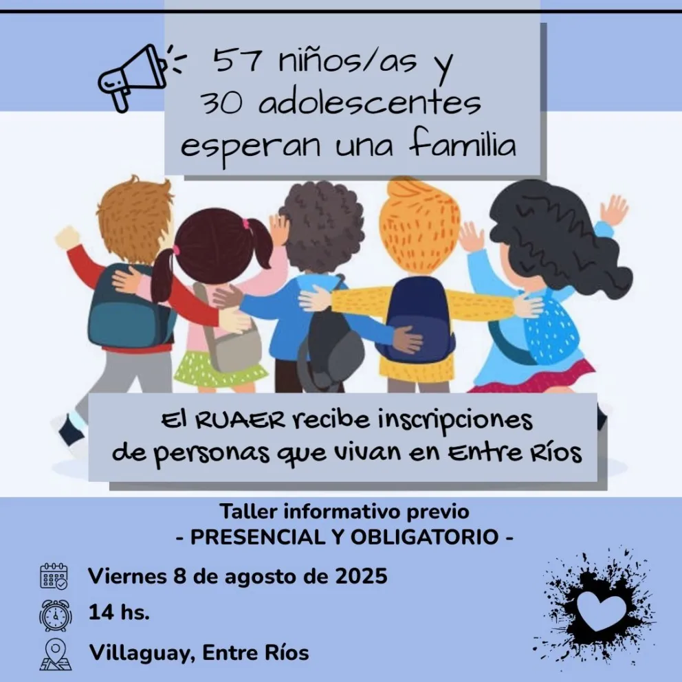 A partir del 11 de agosto y hasta el 25  inclusive, por un período de 10 días hábiles, estará abierta la tercera convocatoria del año para recibir solicitudes de inscripción al Registro Único de Aspirantes a Guarda con Fines Adoptivos de la provincia de Entre Ríos (Ruaer).  El viernes 8 de agosto a las 14, se llevará a cabo el encuentro obligatorio que se realizará en modalidad presencial en Villaguay. En esta oportunidad, sólo participarán residentes en Entre Ríos.