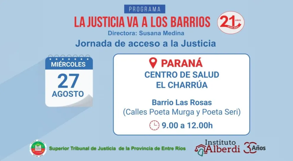 El programa “La Justicia va a los Barrios” –que impulsa el Poder Judicial de Entre Ríos- estará este miércoles de 9 a 12 en el Centro de Salud “El Charrúa” del Barrio Las Rosas (entre calles Poeta Murga y Poeta Seri de Paraná). El objetivo es acercar los servicios de justicia a los vecinos: se podrán realizar trámites y consultas.
