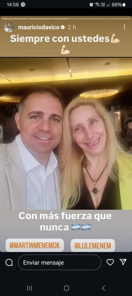 En su cuenta de Instagram – mauriciodavico – publico una historia donde se observa al Presidente Municipal junto con la hermana del Presidente y un escrito: “Siempre con ustedes. Con más fuerza que nunca” junto con un emoji de la bandera de Argentina.