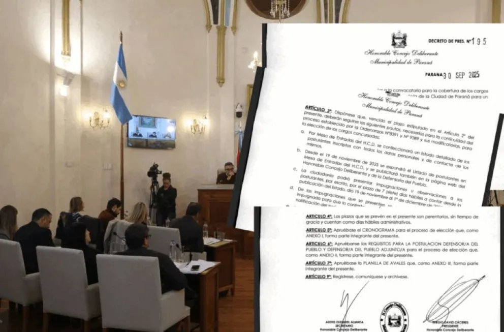 El artículo 2° del decreto convoca a “la ciudadanía a concurso de postulantes para cubrir los cargos de Defensor/a del Pueblo y Defensor/a del Pueblo Adjunto/a de la ciudad de Paraná. Los candidatos deberán inscribirse en Mesa de Entradas del Honorable Concejo Deliberante de la ciudad de Paraná, sita en Andrés Pazos N° 124, desde el 27 de octubre al 18 de noviembre”.