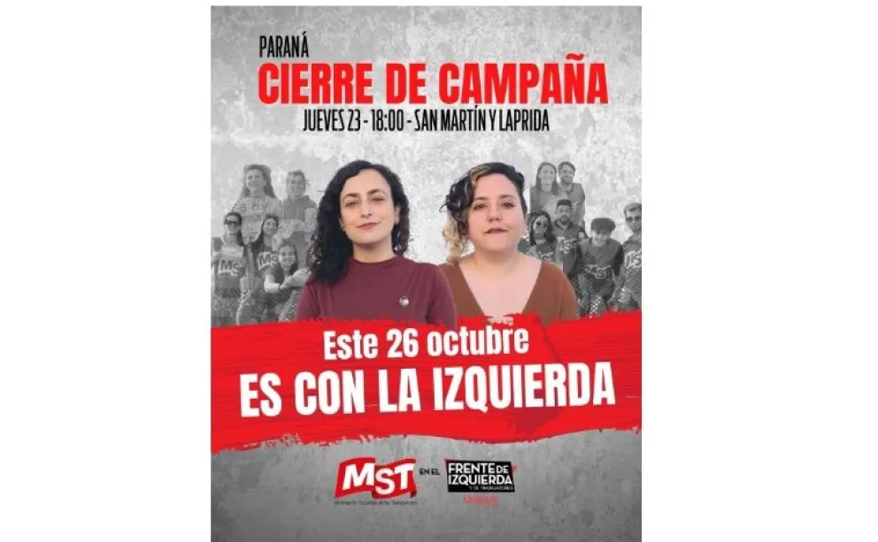La Lista 68 del Movimiento Socialista de los Trabajadores (MST) en el Frente de Izquierda y de Trabajadores - Unidad (FITU) realizará un “cierre militante” de campaña este jueves a las 18 en la intersección de calles San Martin y Laprida de Paraná. “Es con la izquierda” es la consigna del espacio que se presenta como una alternativa real ante el agotamiento del gobierno "ajustador, coimero y estafador" y “las frustraciones del pasado”.