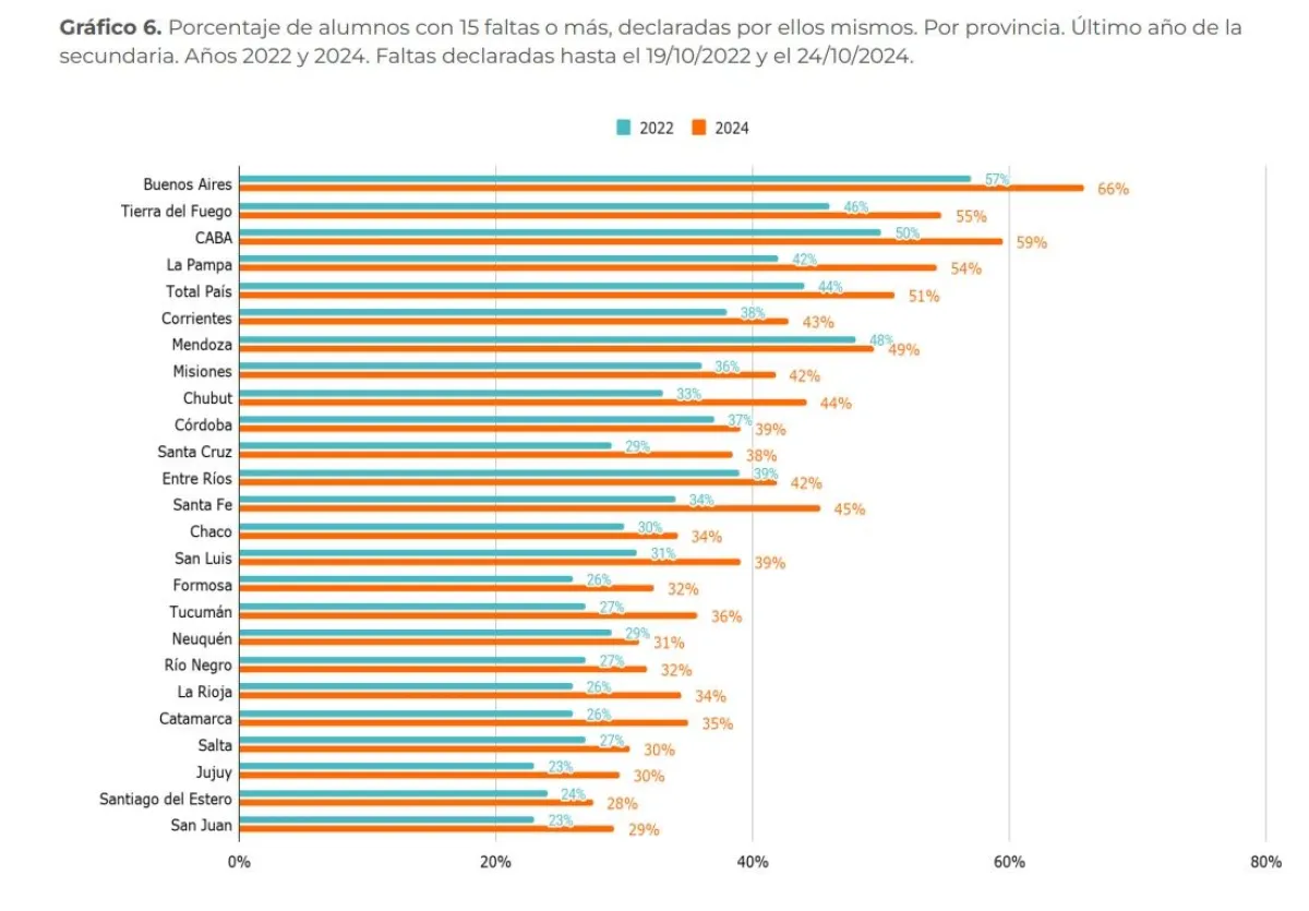Aunque se trata de una tendencia global –según PISA 2022, el 47% de los directores argentinos identifica el ausentismo como un límite para enseñar–, en el país adquiere rasgos propios. Entre ellos, fuertes desigualdades territoriales. Buenos Aires lidera con un 66% de estudiantes que faltan al menos 15 días, seguida por CABA (59%), Tierra del Fuego (55%) y La Pampa (54%). En el otro extremo aparecen Santiago del Estero (28%), San Juan (29%) y Jujuy (30%).